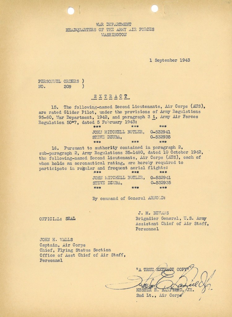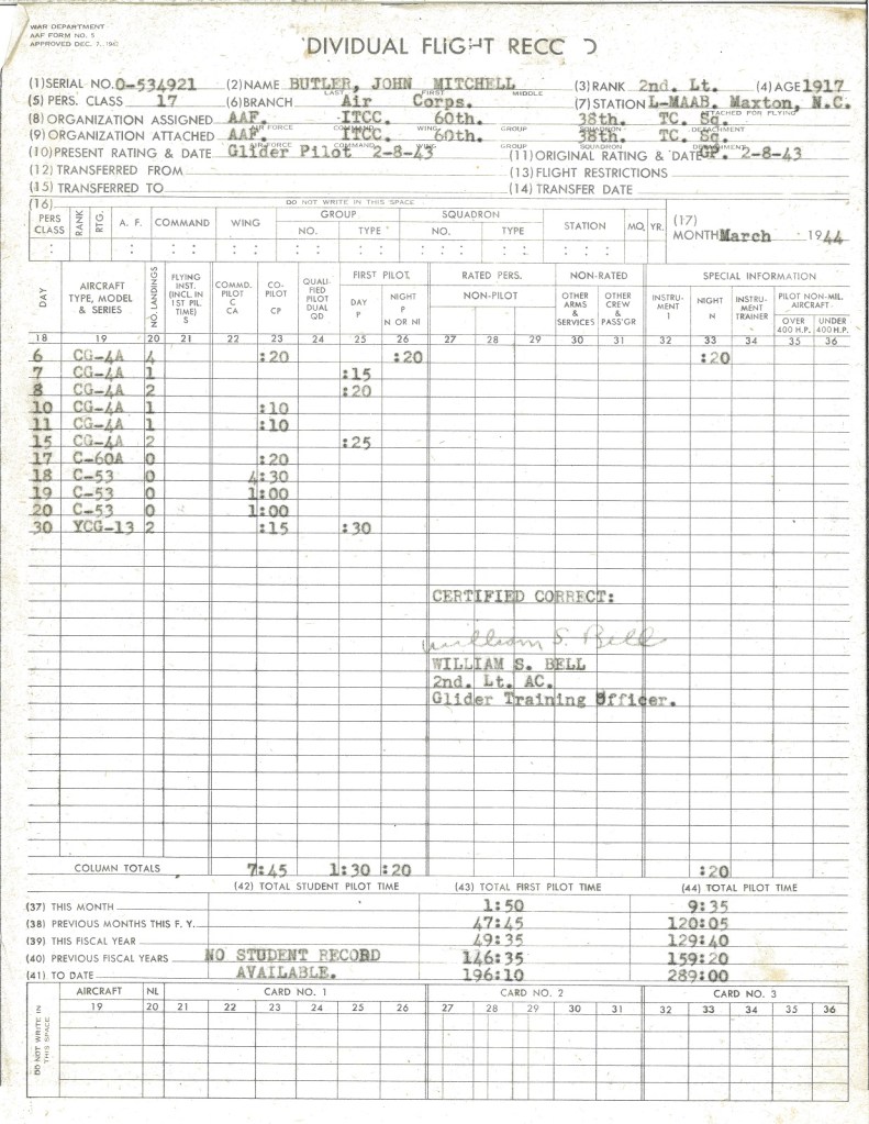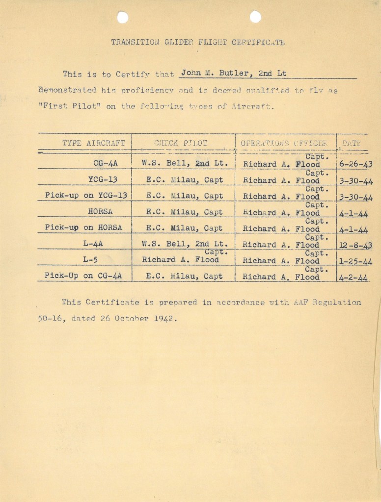 Butler was commissioned as a 2nd lieutenant on September 1, 1943. A flight physical dated February 15, 1944, stated that 2nd Lieutenant Butler had 1,200 hours of flight time as a pilot including 125 hours in the last six months. Butler was certified to pilot the main American glider—the Waco CG-4A—as well as the larger Waco YCG-13 and a British glider, the Airspeed Horsa. Even after qualifying as a glider pilot, Flight Officer Butler continued to log hours piloting powered light aircraft.