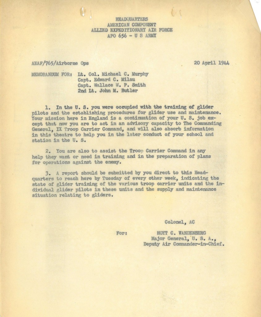1. In the U.S. you were occupied with the training of glider pilots and establishing procedures for glider use and maintenance. Your position here in England is a continuation of your U. S. job except that now you are to act in an advisory capacity to The Commanding General, IX Troop Carrier Command, and will also absorb information in this theater to help you in the later conduct of your school and station in the U. S.