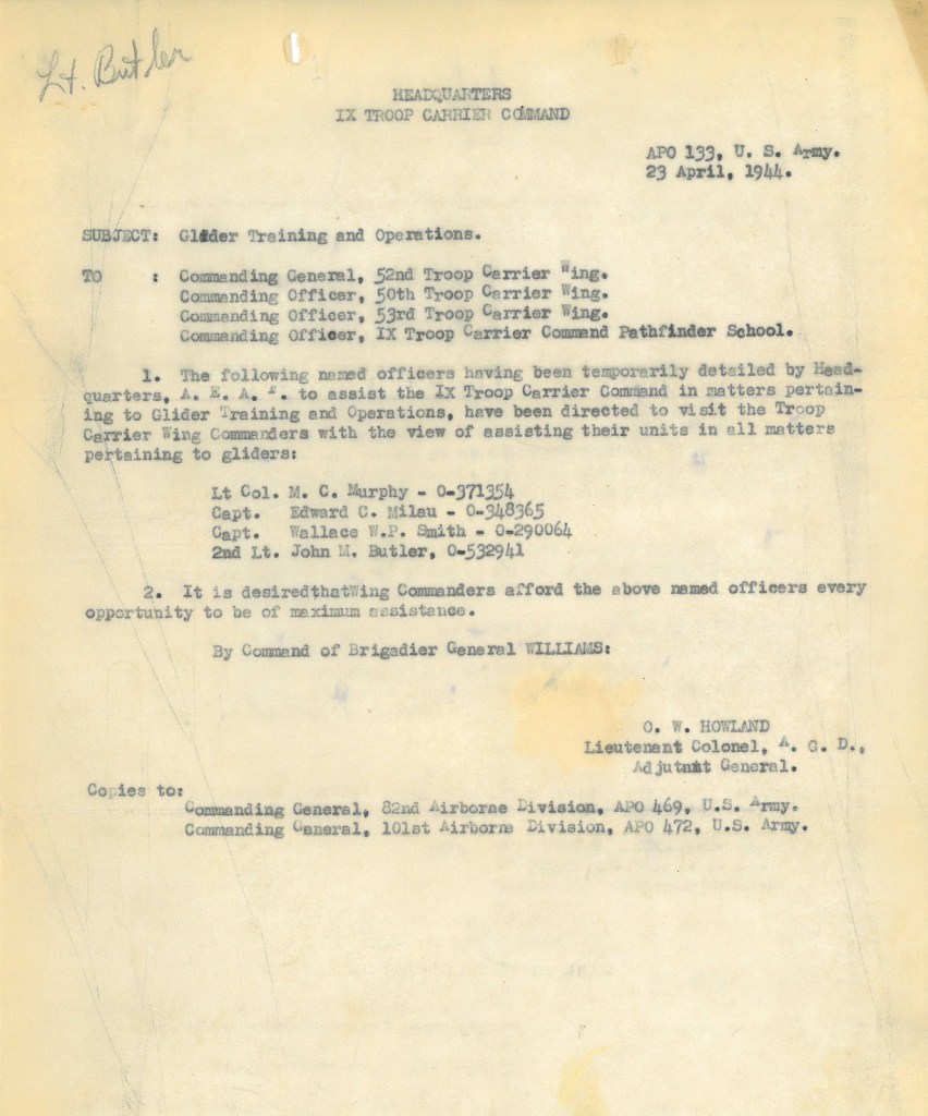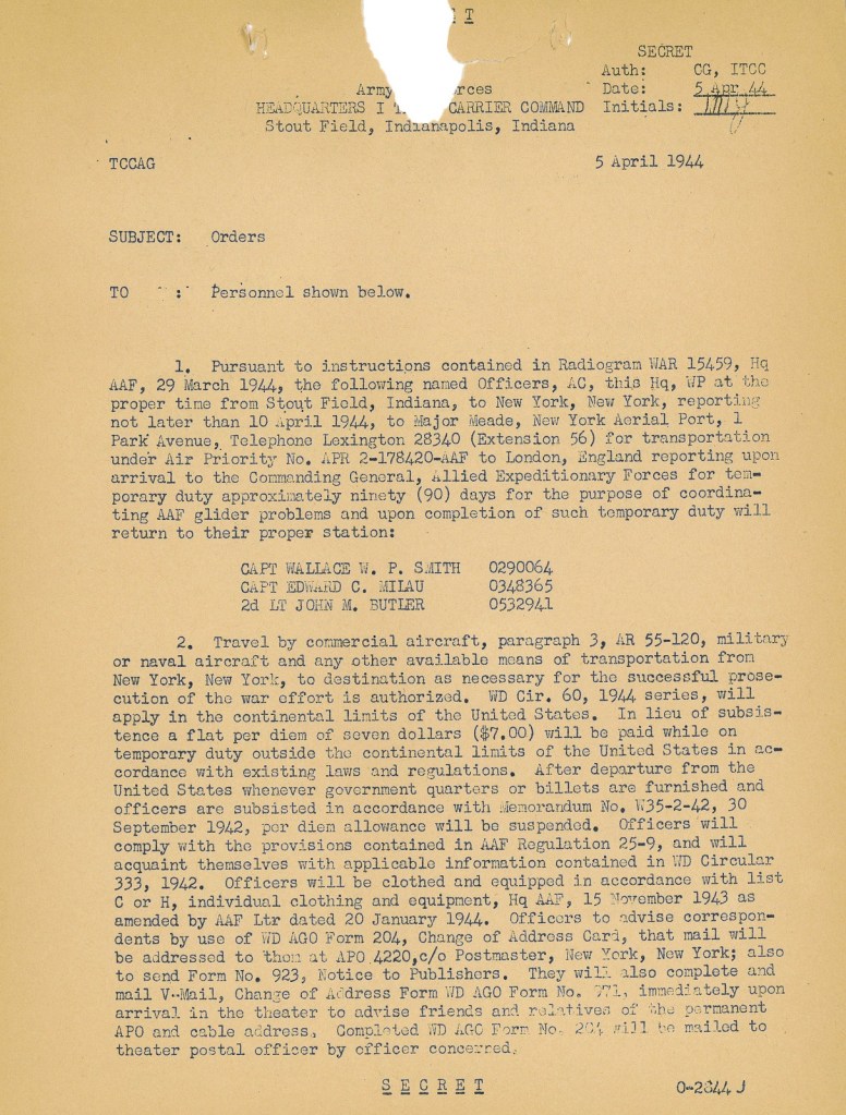 2nd Lieutenant Butler’s relatively low rank belied his importance to the American glider program. On April 3, 1944, 2nd Lieutenant Butler and two other officers, Captain Wallace Winthrop Peabody Smith (1908–1995) and Captain Edward C. Milau (1912 or 1914–1967), transferred from the 38th Troop Carrier Squadron to Headquarters I Troop Carrier Command at Stout Field, Indianapolis, Indiana. A set of orders dated April 5, 1944, dispatched them to London, “reporting upon arrival to the Commanding General, Allied Expeditionary Forces for temporary duty approximately ninety (90) days for the purpose of coordinating AAF glider problems[.]”
