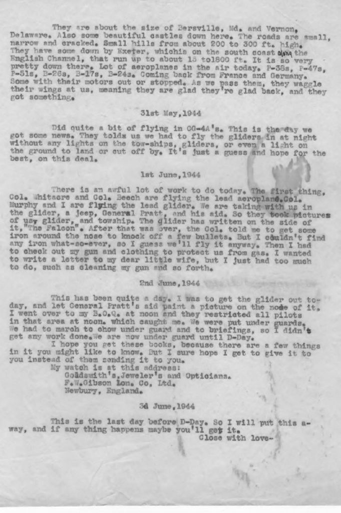 I was to get the glider out today, and let General Pratt’s aid[e] paint a picture on the nose of it. I went over to my B.O.Q. [bachelor officer quarters] at noon and they restricted all pilots in that area at noon. […] We are now under guard until D-Day.