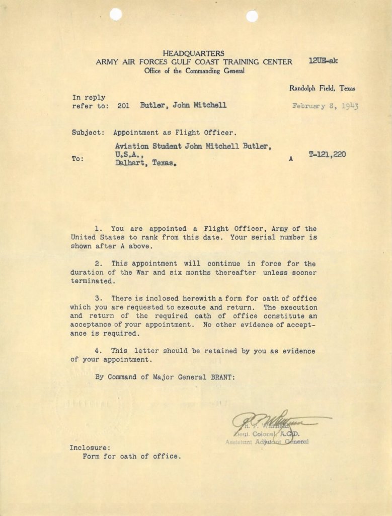 Butler’s enlistment data card states that he enlisted in Wilmington on January 8, 1942. That was supported by his discharge paperwork from February 7, 1943, a formality that occurred before he was appointed flight officer the following day. His mother’s statement reported that he enlisted in Georgetown, Delaware, on January 8, 1942 and that he left for Fort Dix around January 10.