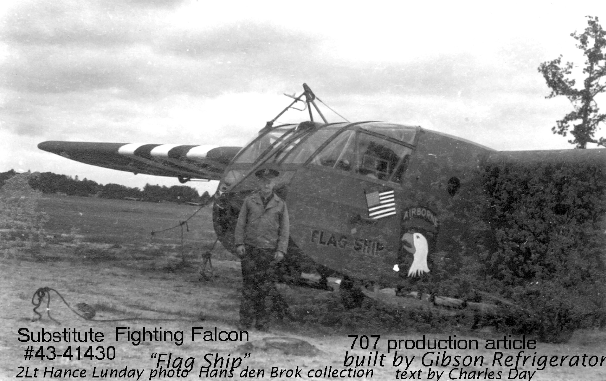 According to Spencer, that same day, “Colonel Murphy decided to replace the original Falcon with a CG-4A equipped with the frontal crash protection device, the Griswold Nose.” In doing so, Murphy gave up a different safety device that the original Falcon was equipped with, a deceleration parachute. (See Appendix II below for a discussion of the possible consequences.) The replacement glider, 43-41430 (also manufactured by Gibson Refrigerator), was then painted as another Fighting Falcon.