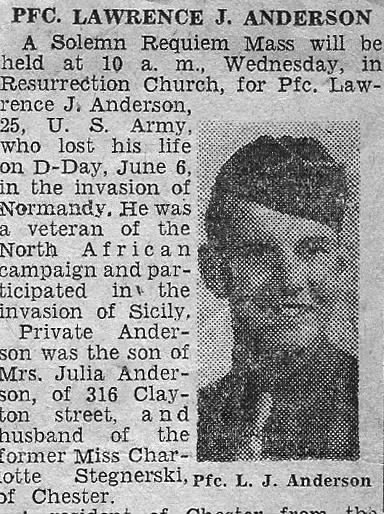 “PFC. Lawrence J. Anderson.” Newspaper clipping from an unknown paper (probably the area of Chester, Pennsylvania), circa 1944. Courtesy of Janice Tunell.