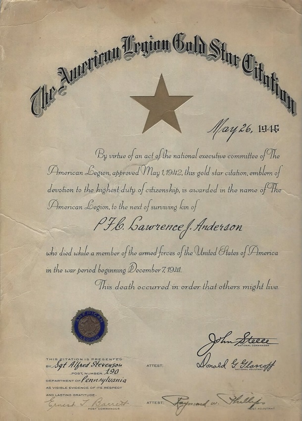 Headstone Inscription and Interment Record for Lawrence J. Anderson. Headstone Inscription and Interment Records for U.S. Military Cemeteries on Foreign Soil, 1942–1949. Record Group 117, Records of the American Battle Monuments Commission, 1918–c. 1995. National Archives at Washington, D.C.https://www.ancestry.com/imageviewer/collections/9170/images/42861_647350_0535-01456