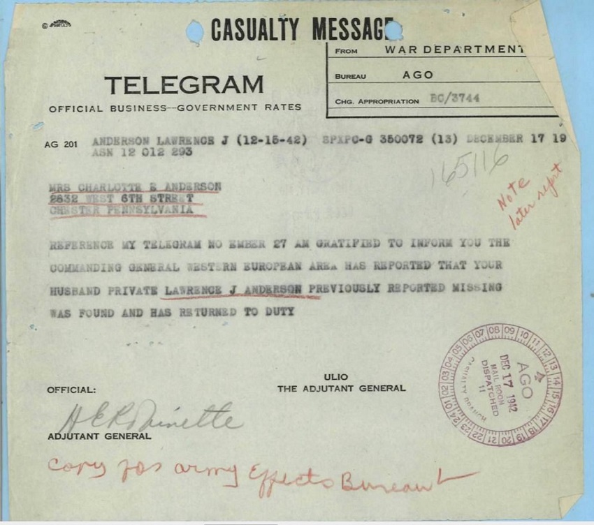 Anderson’s individual deceased personnel file (I.D.P.F.) includes a copy of a telegram from the Adjutant General to Anderson’s wife dated December 15, 1942, stating: “REFERENCE MY TELEGRAM NO[V]EMBER 27 AM GRATIFIED TO INFORM YOU THE COMMANDING GENERAL WESTERN EUROPEAN AREA HAS REPORTED THAT YOUR HUSBAND PRIVATE LAWRENCE J ANDERSON PREVIOUSLY REPORTED MISSING WAS FOUND AND HAS RETURNED TO DUTY[.]”