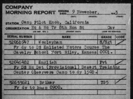 Morning Reports for 1st Cavalry School Detachment. November 1943. U.S. Army Morning Reports, c. 1912–1946. Record Group 64, Records of the National Archives and Records Administration. National Archives at St. Louis, Missouri. https://s3.amazonaws.com/NARAprodstorage/lz/partners/st-louis/rg-064/85713825-wwii/85713825_1943-11/85713825_1943-11_Roll-0058/85713825_1943-11_Roll-0058-14.pdf