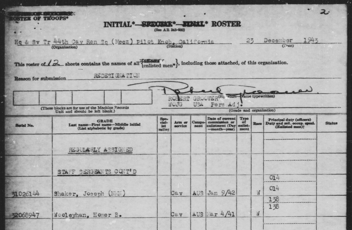 “Initial Roster Hq & Sv Tr 44th Cav Rcn Sq (Mecz).” December 23, 1943. U.S. Army Muster Rolls and Rosters, November 1, 1912 – December 31, 1943. Record Group 64, Records of the National Archives and Records Administration. National Archives at St. Louis, Missouri. https://s3.amazonaws.com/NARAprodstorage/lz/st-louis/rg-064/85713803_1940-1943/85713803_1940-1943_Roll-0179/85713803_1940-1943_Roll-0179_04.pdf