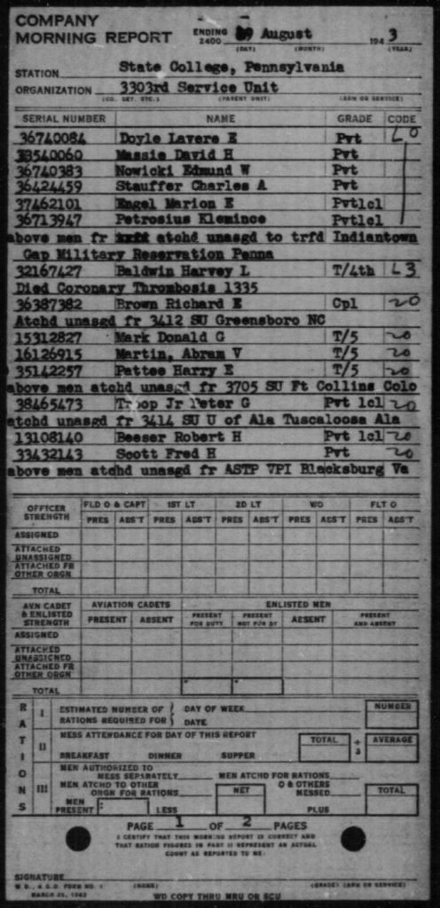 After passing the selection process, Baldwin was ordered to report to the Army Specialized Training Unit at Pennsylvania State College (now Pennsylvania State University) in State College, Pennsylvania, on May 22, 1943, “to pursue course of instruction in Chemical Engineering Term 4A[.]” From that date onward, Technician 4th Grade Baldwin was attached unassigned to the 3303rd Service Unit (Army Specialized Training) at Pennsylvania State College. Under the U.S. Army’s administrative procedures, Baldwin and several hundred soldiers studying there were attached to the 3303rd, but only a handful of cadremen were actually considered to be members of that unit.