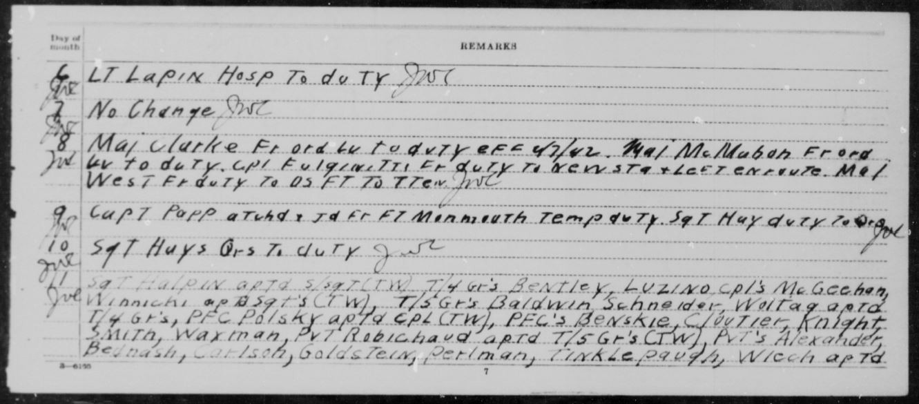 Morning Reports for General Dispensary, New York City. November 1942 – May 1943. U.S. Army Morning Reports, c. 1912–1946. Record Group 64, Records of the National Archives and Records Administration. National Archives at St. Louis, Missouri. https://s3.amazonaws.com/NARAprodstorage/lz/partners/st-louis/rg-064/85713825-wwii/85713825_1940-01-thru-1943-07/85713825_1940-01-thru-1943-07_Roll-2990/85713825_1940-01-thru-1943-07_Roll-2990-16.pdf