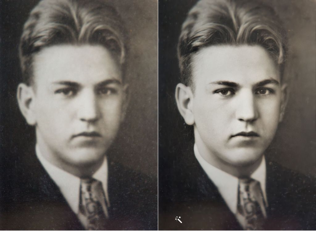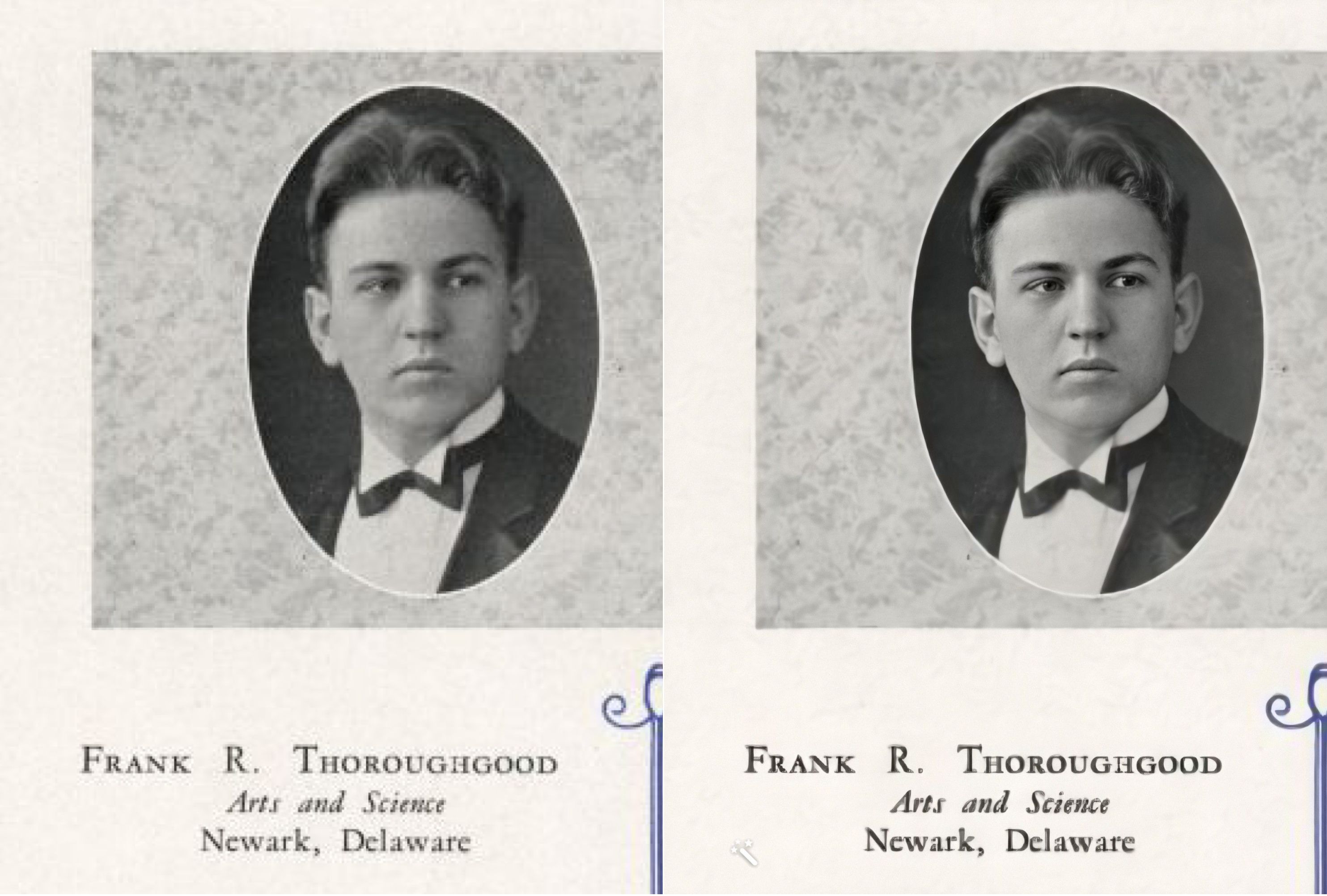 The photos on this page were digitally enhanced using tools on the genealogy website MyHeritage. This software is useful in instances where the only known photograph is of limited resolution (due to the resolution of yearbook printing in one case and because a somewhat fuzzy picture had to be photographed behind glass in the other). I believe them to be accurate reconstructions, but the software could potentially introduce errors by misinterpreting fuzzy details in the original photograph. A comparison of the original and enhanced versions of the photos can be viewed below.