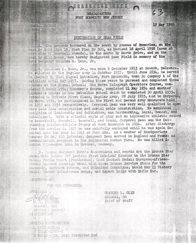 According to a summary of his career in General Order No. 58 (Headquarters Fort Monmouth dated May 19, 1959), Dean