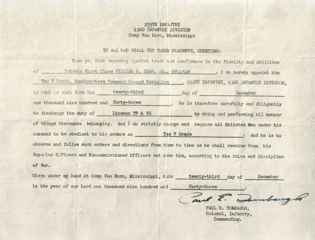 Dean reentered the service as a private but advanced rapidly. He was promoted from private to private first class on November 6, 1943. By December 1943, he was a lineman, telephone & telegraph in Headquarters Company, 2nd Battalion, 255th Infantry Regiment, 63rd Infantry Division at Camp Van Dorn, Mississippi. On December 23, 1943, Dean was promoted from private 1st class to technician 5th grade (at the same pay grade as corporal, which he had reached during his stint in the Regular Army in the 1930s).