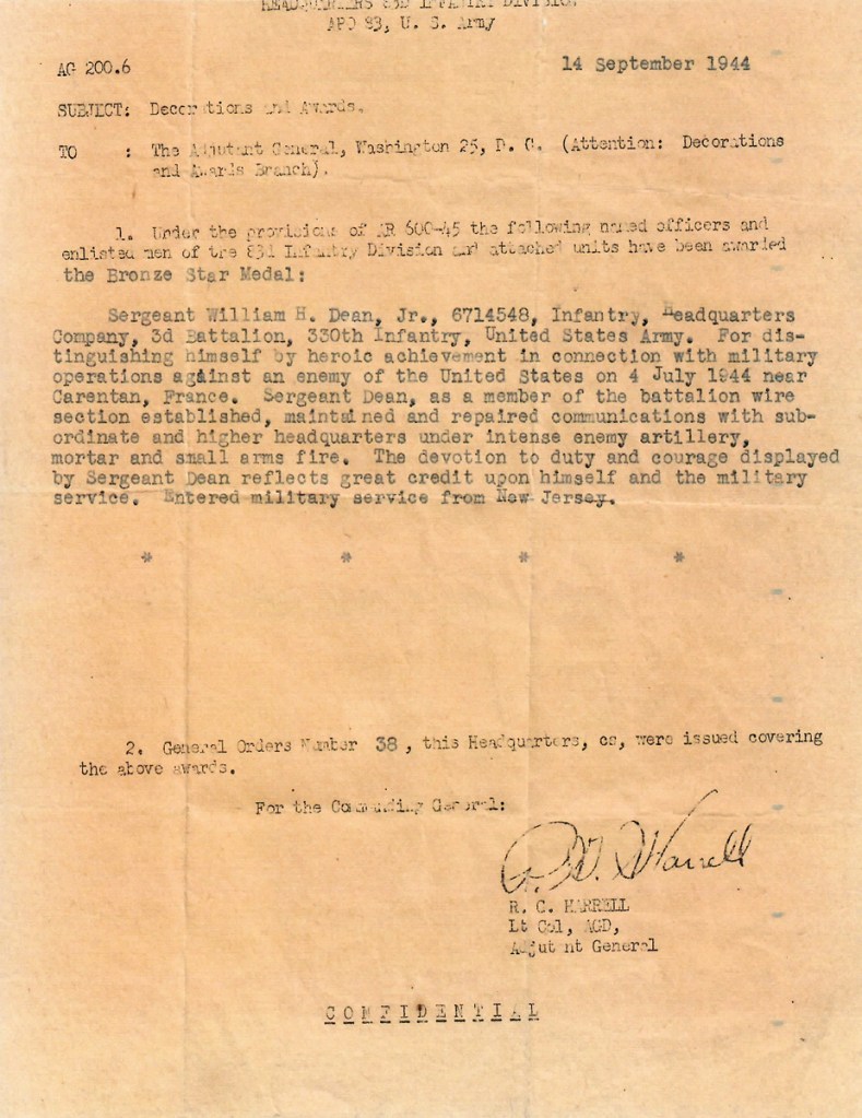 By February 25, 1944, Technician 5th Grade Dean was a member of Communications Platoon, Headquarters Company, 3rd Battalion, 330th Infantry Regiment, 83rd Infantry Division at Camp Breckenridge, Kentucky. He shipped out from the New York Port of Embarkation on April 6, 1944, arriving in England ten days later. On the afternoon of June 20, 1944, Headquarters Company boarded a ship at Southampton. The transport set sail at 0500 hours on the morning of June 23, 1944. Their ship arrived at Utah Beach at 1500 hours; the unit disembarked around 2300 hours that night.