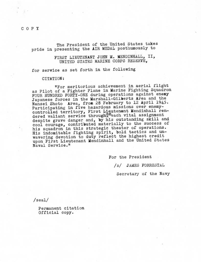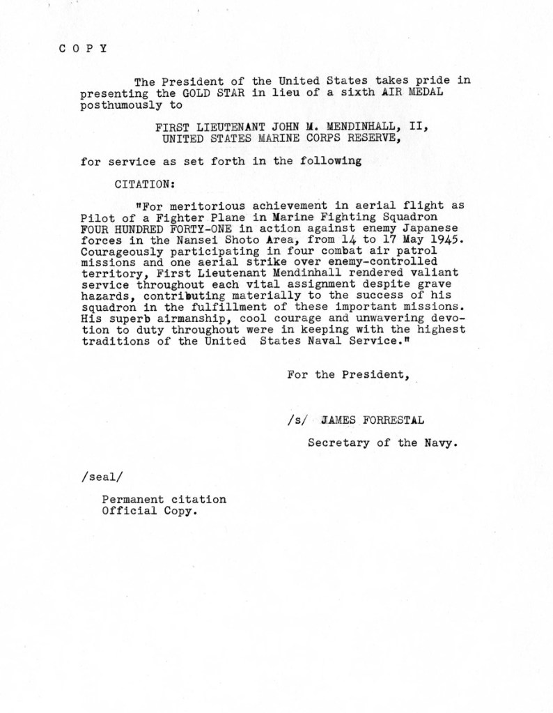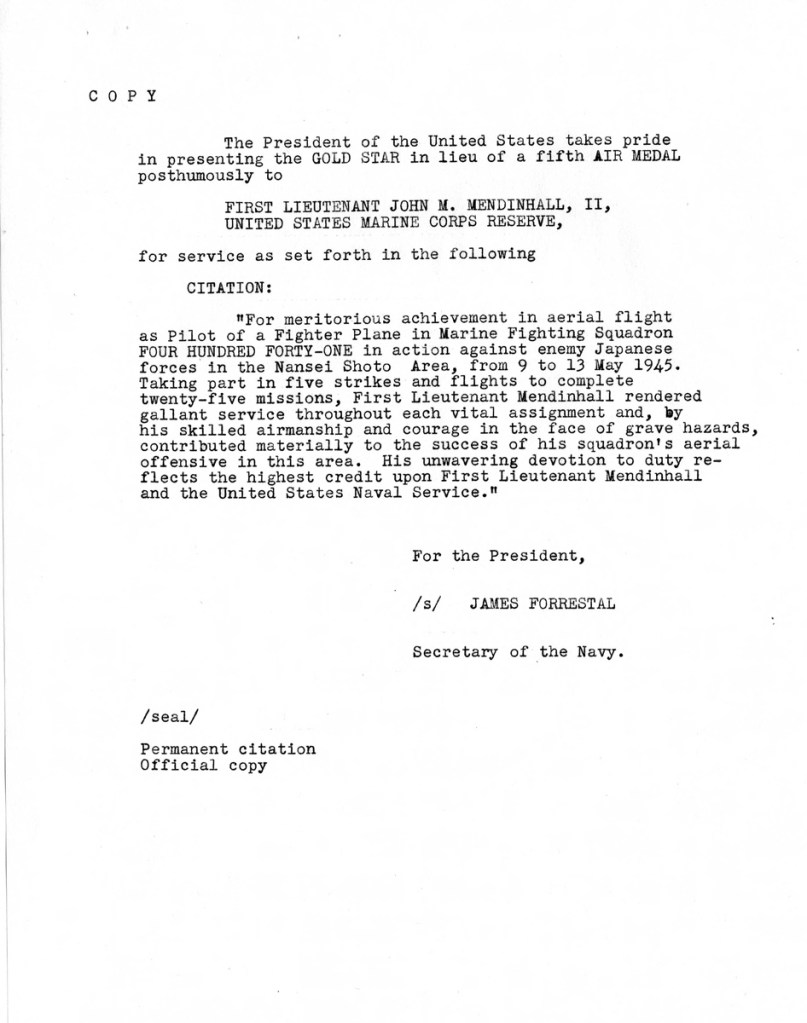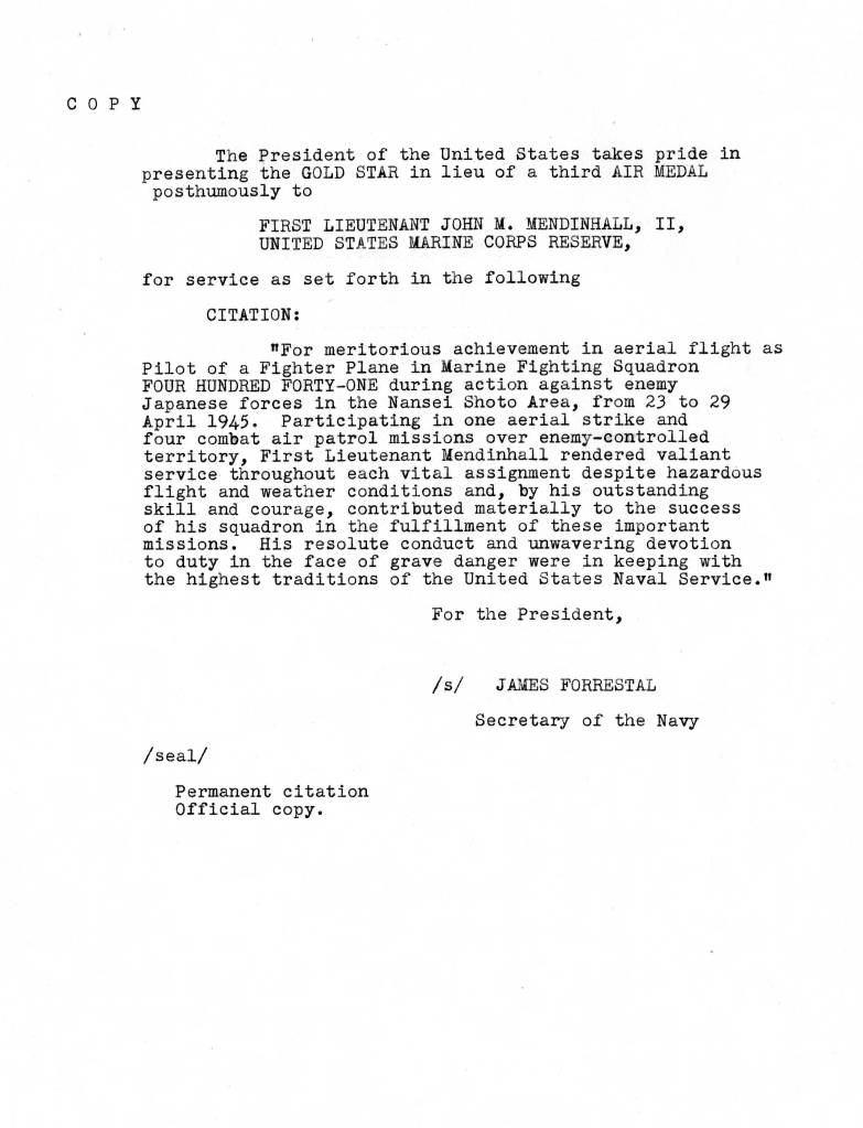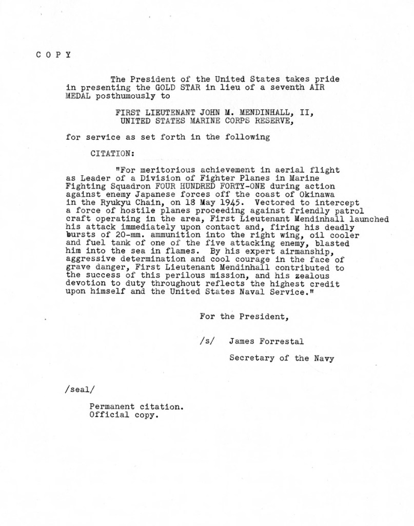 Lieutenant Mendinhall was credited with shooting down a Kawasaki Ki-61 (referred to by the Allies as the “Tony”) while flying an F4U-1C during a combat air patrol sortie on May 18, 1945. During the engagement, five Marine pilots claimed a total of four Japanese planes shot down and one probably shot down without loss to the Americans. The citation for a gold star (in lieu of a seventh Air Medal) awarded to Lieutenant Mendinhall stated in part: