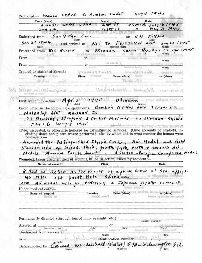 Mendinhall, Edward. Individual Military Service Record for John Marshall Mendinhall. Undated, c. 1946. Record Group 1325-003-053, Record of Delawareans Who Died in World War II. Delaware Public Archives, Dover, Delaware. https://cdm16397.contentdm.oclc.org/digital/collection/p15323coll6/id/19980