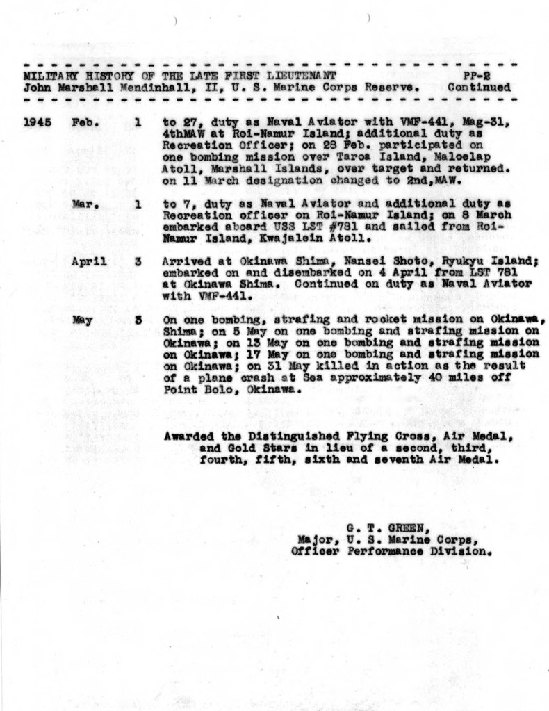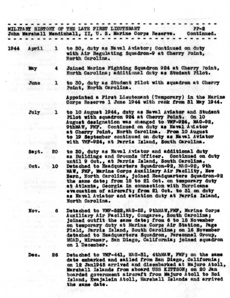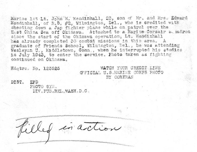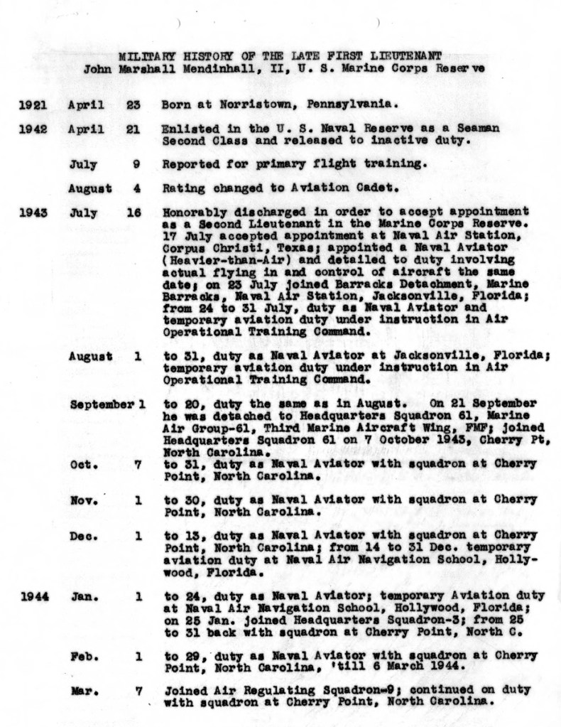 Green, G. T. “Military History of the Late First Lieutenant John Marshall Mendinhall, II, U.S. Marine Corps Reserve.” Record Group 1325-003-053, Record of Delawareans Who Died in World War II. Delaware Public Archives, Dover, Delaware. https://cdm16397.contentdm.oclc.org/digital/collection/p15323coll6/id/19991