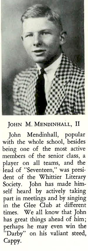 By the time the 1930 census was recorded, the family had moved to 1606 Rodney Street in Wilmington, Delaware. The Mendinhalls were a Quaker family. Mendinhall attended the Friends School in Wilmington, graduating in 1939. (His sister also attended Wilmington Friends.) Mendinhall’s yearbook entry stated: