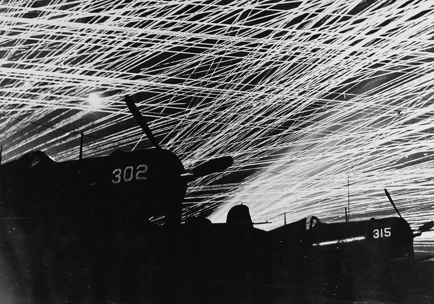 Fifteen radar picket patrol sorites were flown from 1430 to 1830 (ITEM [local time]), totaling 43.8 hours, with negative results. At approximately 1530 (ITEM), two F4U-1C’s (bureau Nos. 82561 and 82263), were destroyed as a result of a mid-air collision while patrolling over Radar Picket Post #5. No survivors were observed in the area and the pilots, First Lt. John M. Mendinhall II, (026617), and First Lt. Bonneville Smith (029565), are carried on the records as ‘Killed in action as the result of plane crash at sea.’ The cause of the accident is believed to be adverse weather conditions.