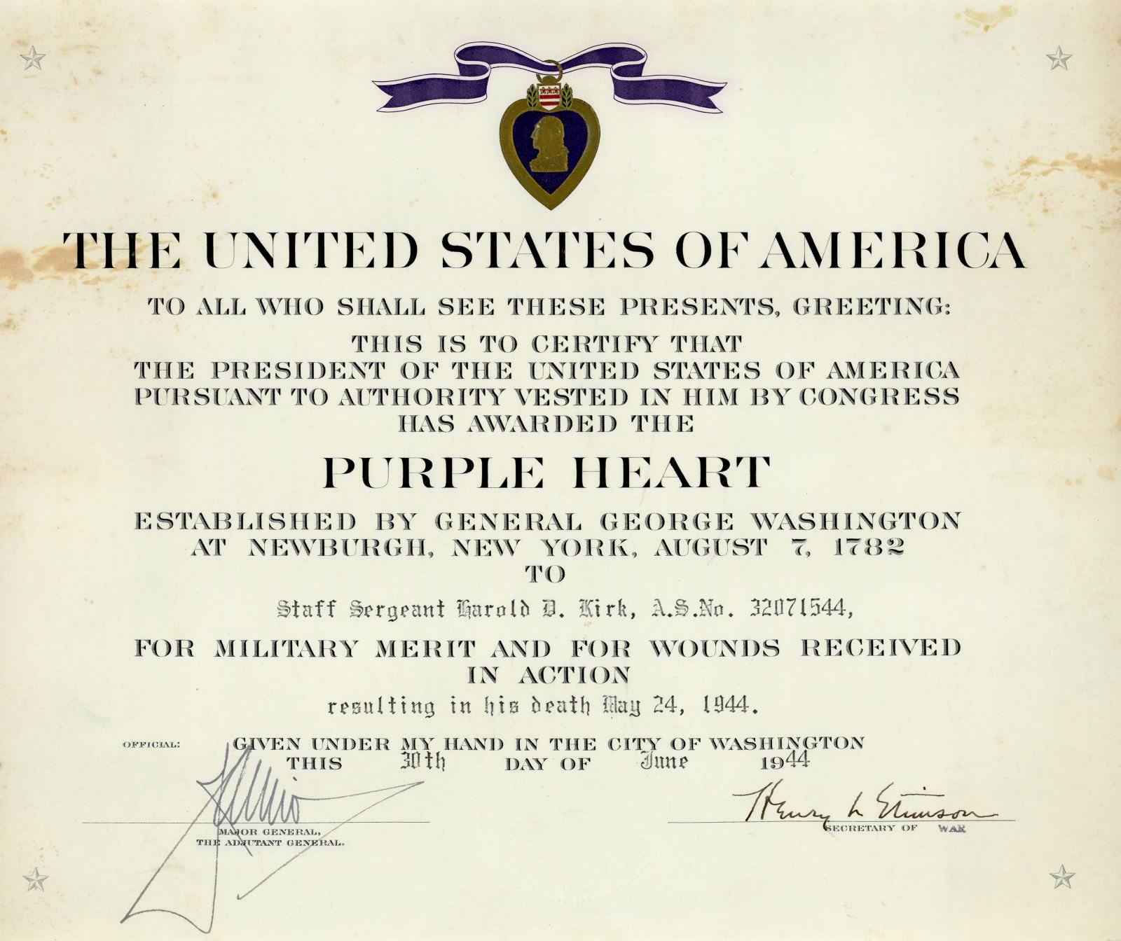 Staff Sergeant Kirk’s decorations include the American Defense Service Medal, the Good Conduct Medal, and the Purple Heart.