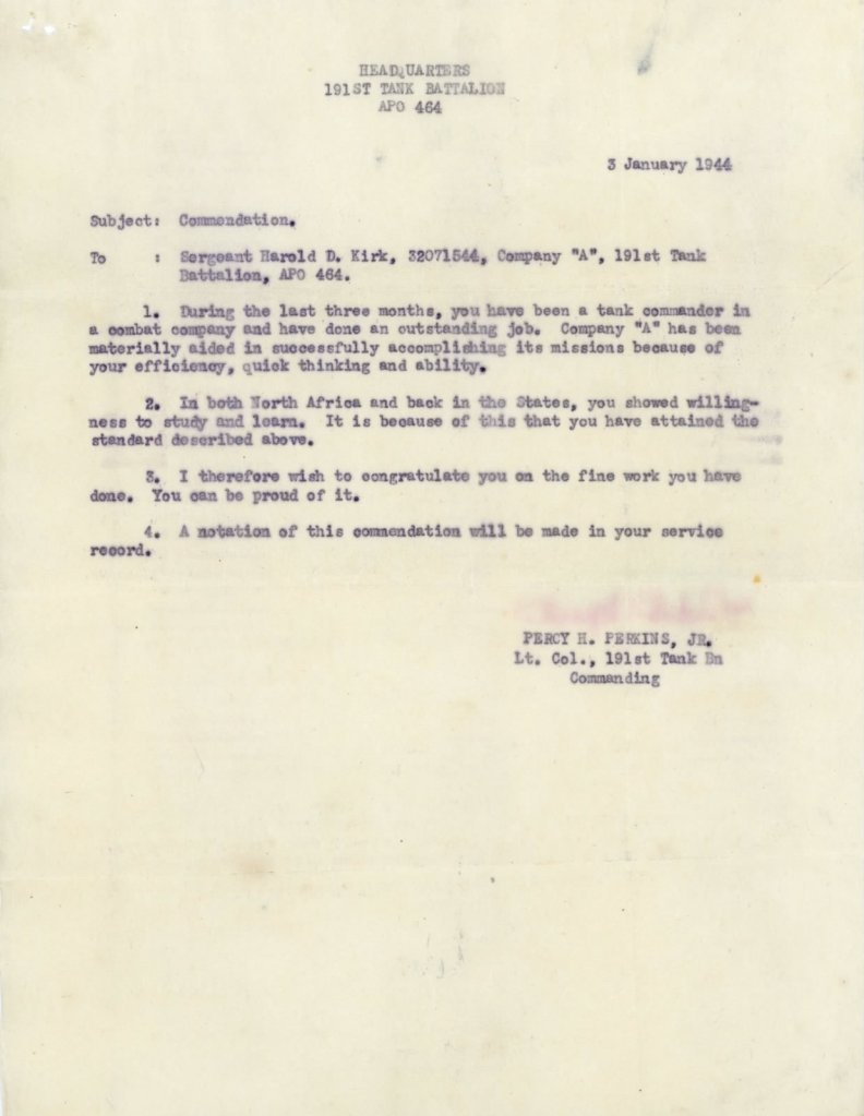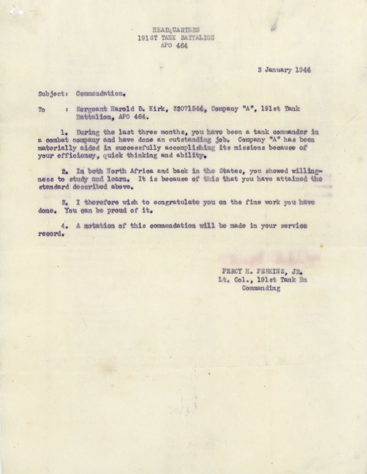 A January 3, 1944, letter of commendation to Sergeant Kirk from the 191st Tank Battalion’s commanding officer, Lieutenant Colonel Percy H. Perkins, Jr., stated in part: