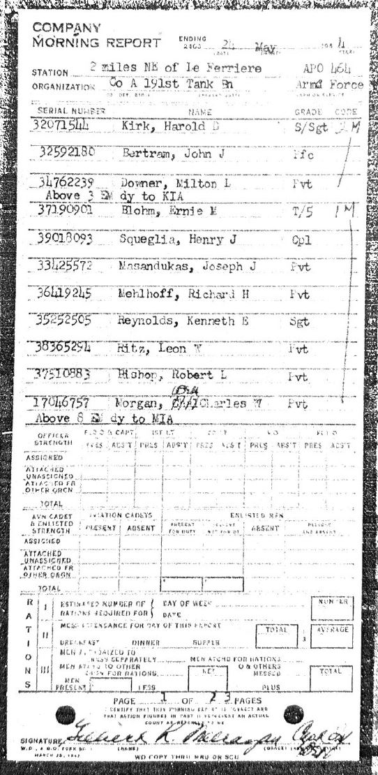 Morning reports for Company “A,” 191st Tank Battalion. May 1941 – July 1943. U.S. Army Morning Reports, c. 1912–1946. Record Group 64, Records of the National Archives and Records Administration. National Archives at St. Louis, Missouri. https://s3.amazonaws.com/NARAprodstorage/lz/partners/st-louis/rg-064/85713825-wwii/85713825_1940-01-thru-1943-07/85713825_1940-01-thru-1943-07_Roll-2645/85713825_1940-01-thru-1943-07_Roll-2645-04.pdf, https://s3.amazonaws.com/NARAprodstorage/lz/partners/st-louis/rg-064/85713825-wwii/85713825_1940-01-thru-1943-07/85713825_1940-01-thru-1943-07_Roll-2645/85713825_1940-01-thru-1943-07_Roll-2645-05.pdf, https://s3.amazonaws.com/NARAprodstorage/lz/partners/st-louis/rg-064/85713825-wwii/85713825_1940-01-thru-1943-07/85713825_1940-01-thru-1943-07_Roll-2645/85713825_1940-01-thru-1943-07_Roll-2645-06.pdf, https://s3.amazonaws.com/NARAprodstorage/lz/partners/st-louis/rg-064/85713825-wwii/85713825_1940-01-thru-1943-07/85713825_1940-01-thru-1943-07_Roll-2645/85713825_1940-01-thru-1943-07_Roll-2645-08.pdf
