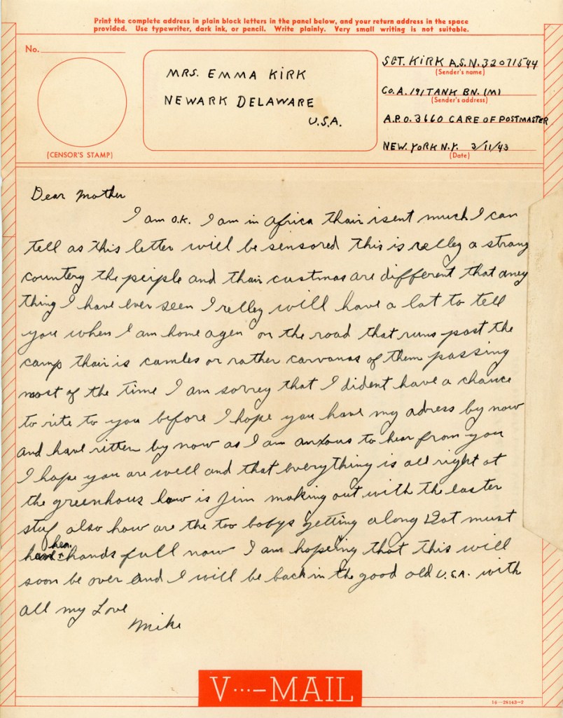 The 191st Tank Battalion arrived in Casablanca, Morocco, on March 9, 1943. Two days later, Sergeant Kirk wrote to his mother that he had arrived in North Africa. Unable to discuss much about the war due to censorship, his letters home mainly discussed family and the flower business. On April 25, 1943, he wrote his mother: “Today is Easter and I imagine you are very tired after the rush[,] you said that the tulips were early so it must have been hard getting enough plants and flowers to go around”.