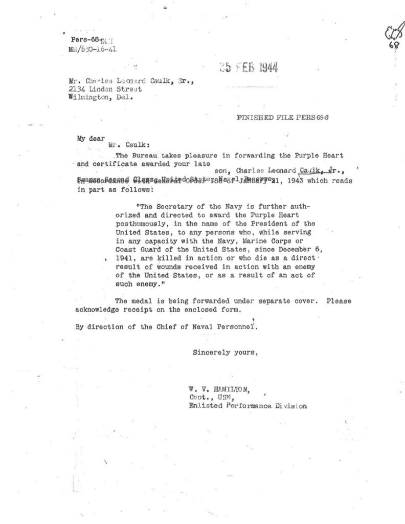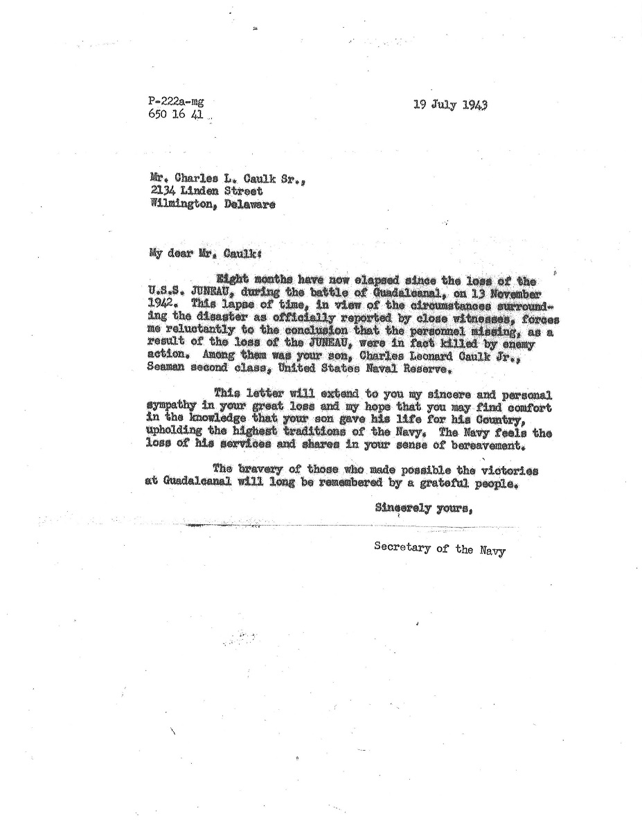 A telegram dated January 10, 1943 informed the Caulk family that Seaman 2nd Class Caulk was missing in action. A subsequent letter from Rear Admiral Randall Jacobs dated January 26, 1943 disclosed that the Juneau had been sunk. After months of waiting, a July 19, 1943 letter attributed to Secretary of the Navy Frank Knox stated: