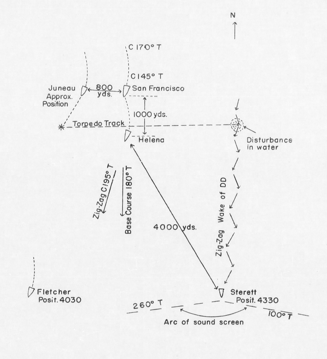 In hushed silence, four deadly fish left at 2359 [Tokyo Standard Time, 0159 local time]. Three minutes and 40 seconds later, a large, reddish flame rose from out target. It was American cruiser Juneau, that had been exchanging gunfire with Yudachi.
