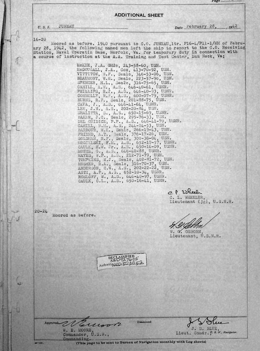 U.S.S. Juneau command logs for February 28, 1942 and March 6, 1942. National Archives at College Park, Maryland. Courtesy of Peter Dem.