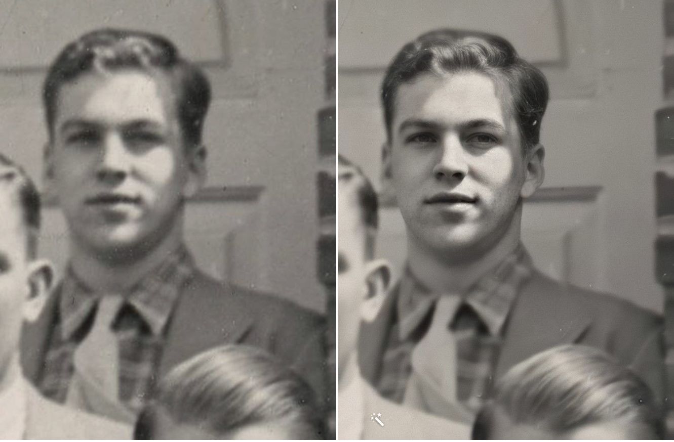 The photo at the top of the page was digitally enhanced using tools on the genealogy website MyHeritage. This software is useful in instances where the only known photograph is of limited resolution (in this case, because it was a detail from a group photo). I believe this to be an accurate reconstruction, but the software could potentially introduce errors by misinterpreting fuzzy details in the original photograph. A comparison of the original and enhanced versions of the photo can be viewed below. The full group photos above were not retouched except to boost contrast and sharpening, something often necessary with old photos.