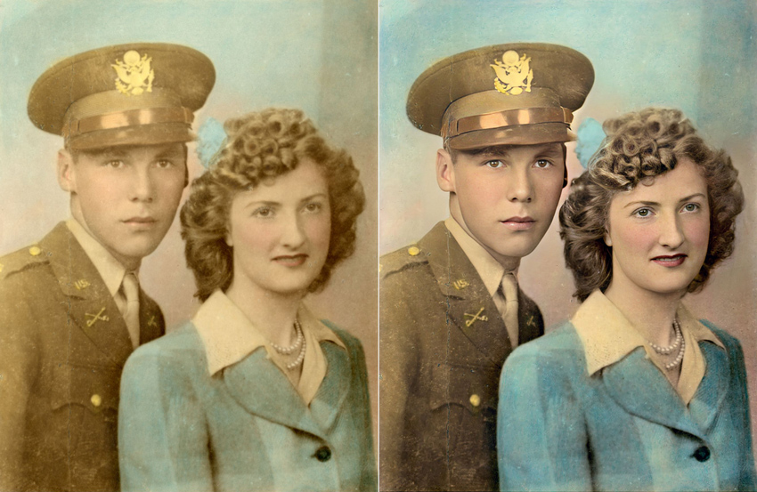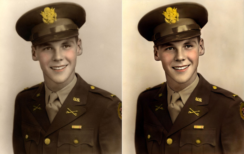 Two photos on this page were digitally enhanced using tools on the genealogy website MyHeritage. This software is useful in instances where the only known photograph is of limited resolution (in this case, because the original prints were rather fuzzy). I believe this to be an accurate reconstruction, but the software could potentially introduce errors by misinterpreting fuzzy details in the original photograph. A comparison of the original and enhanced versions of the photos can be viewed below.