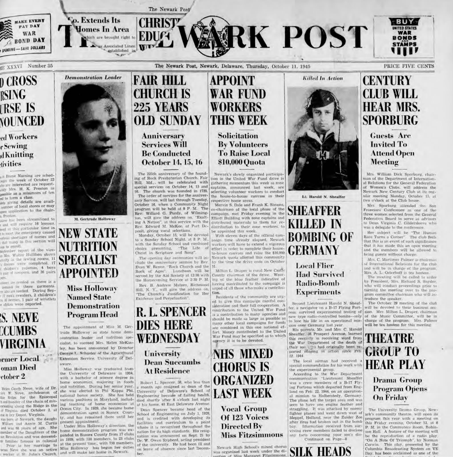 “Sheaffer Killed in Bombing of Germany.” The Newark Post, October 11, 1945. https://udspace.udel.edu/bitstream/handle/19716/19003/np_036_35.pdf