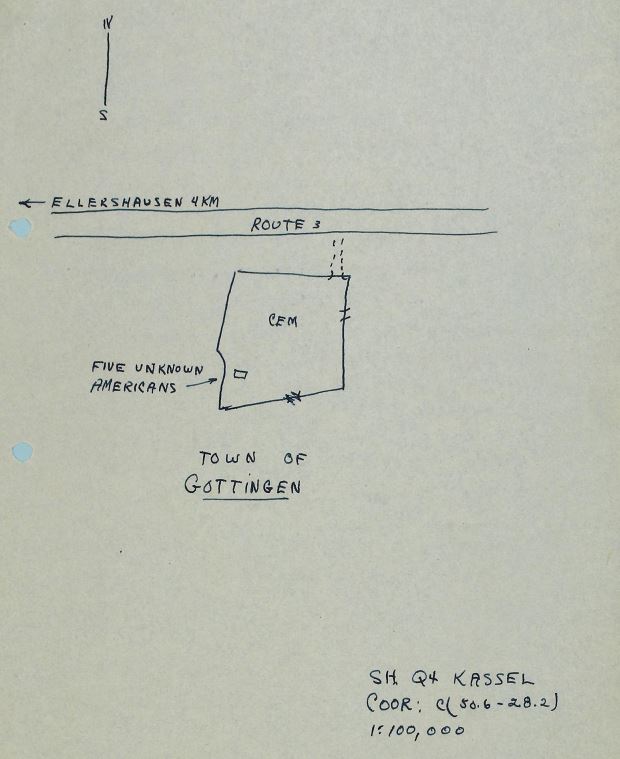 Sheaffer’s body was initially buried at a civilian cemetery in Gottingen, Germany. Typically, German authorities reported killed or captured American air crew through the International Red Cross. For unknown reasons, in Sheaffer’s case they did not. He was initially held as missing in action. With no indication that he could have survived, especially since he had not been located after the collapse of Nazi Germany, the War Department issued a finding of death for Sheaffer effective October 2, 1945. An identification tag was discovered on his body when exhumed by Army graves registration personnel around March 23, 1946. He was reburied at the U.S. military cemetery at Neuville-en-Condroz, Belgium, on April 19, 1946.