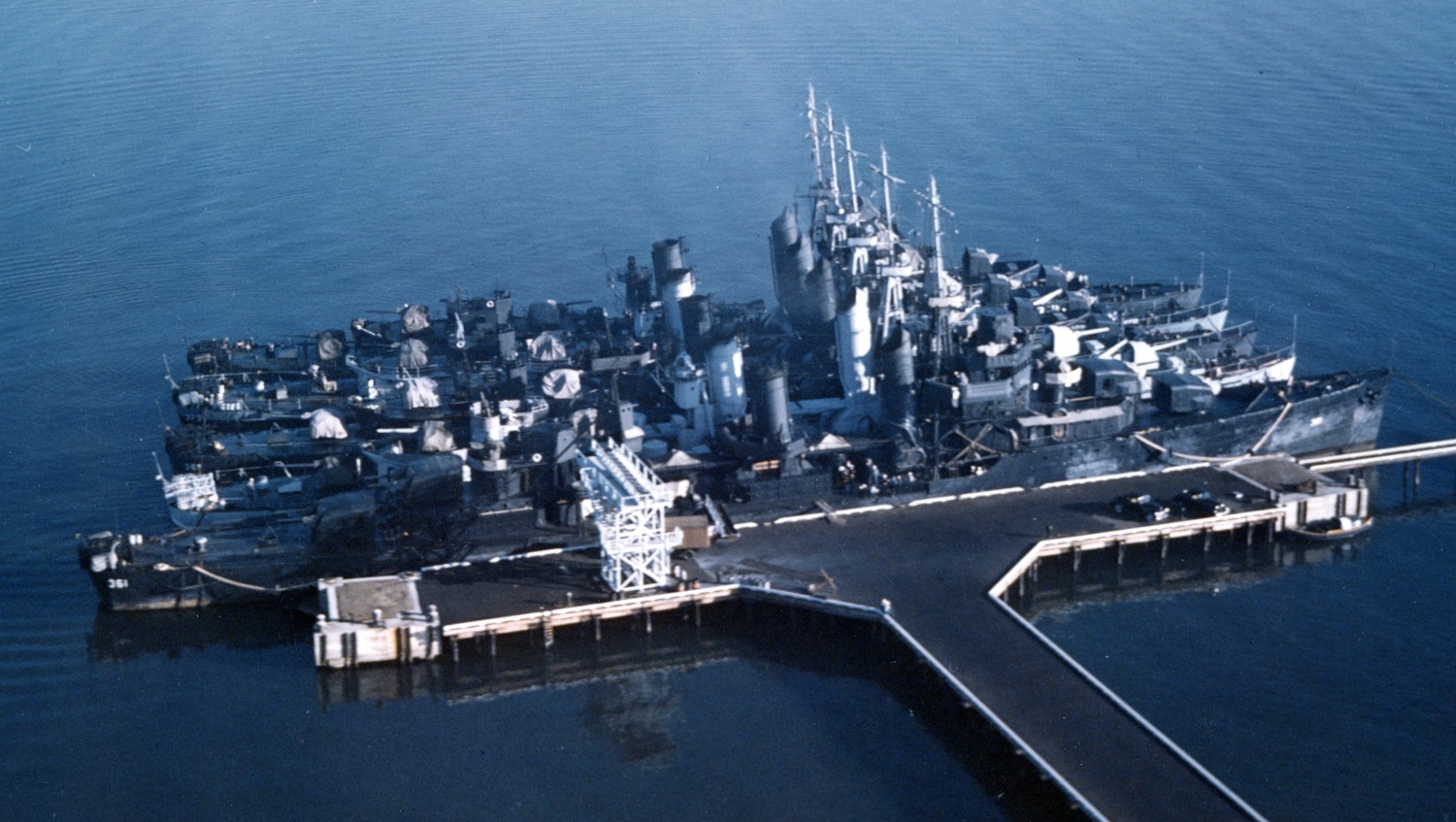 U.S.S. Shaw and four other destroyers at San Diego in October 1941. Shaw is the fourth destroyer away from the dock (that is, the second-most distant from the camera). (Official U.S. Navy photo, National Archives via U.S. Naval History and Heritage Command)