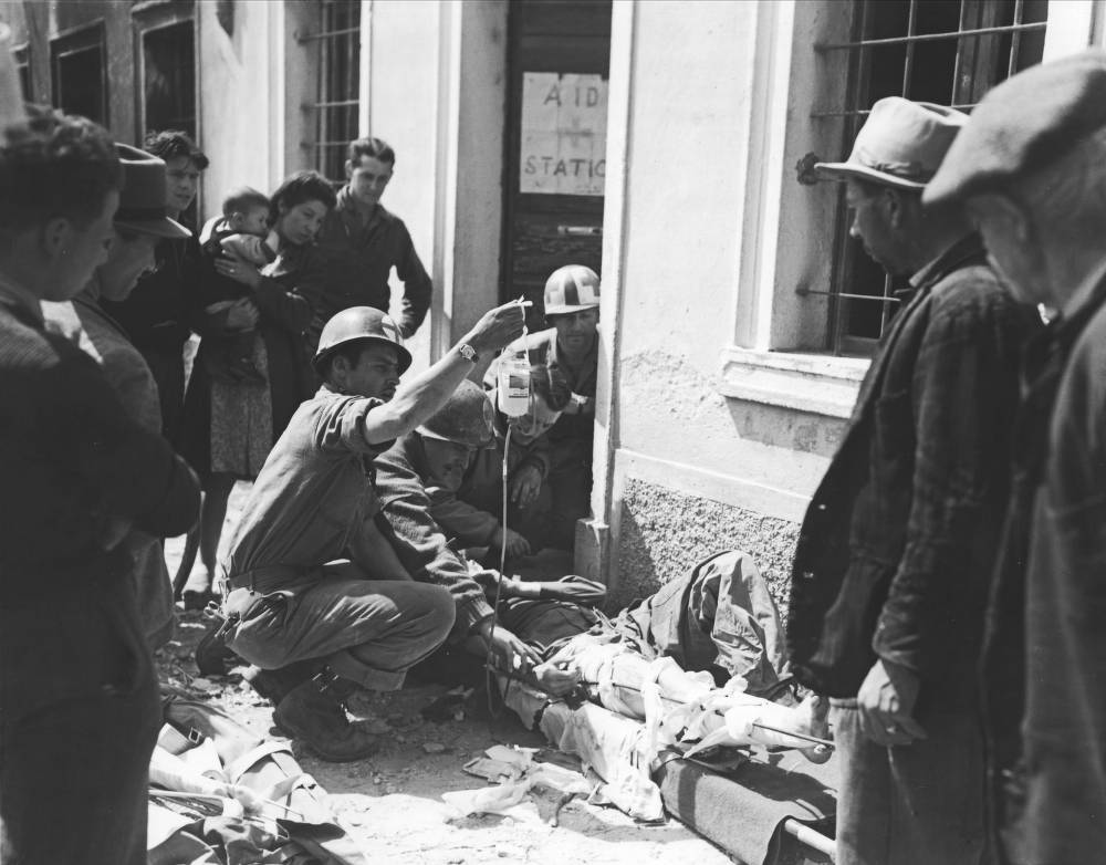 Early in the day the battalion aid station had moved to Mo. Dozzone, southeast of Mt. Pigna. From here they handled the large number of casualties of the day over a litter haul of three difficult miles. Prisoners were used to carry many of the litters because of the shortage of litter bearers.
