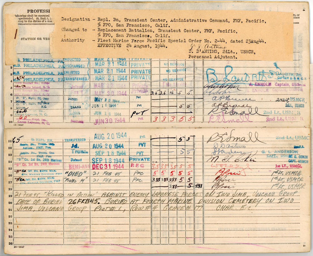 Muster Rolls of the U.S. Marine Corps, 1803–1958. Record Group 127, Records of the U.S. Marine Corps. National Archives at Washington, D.C. https://www.ancestry.com/imageviewer/collections/1089/images/33068_272234-00267 (March 1944), https://www.ancestry.com/imageviewer/collections/1089/images/33068_272248-00266 (April 1944), https://www.ancestry.com/imageviewer/collections/1089/images/33068_267635-00271 (May 1944), https://www.ancestry.com/imageviewer/collections/1089/images/33068_272382-00292, https://www.ancestry.com/imageviewer/collections/1089/images/33068_272157-00559 (June 1944), https://www.ancestry.com/imageviewer/collections/1089/images/33068_272398-00494 (July 1944), https://www.ancestry.com/imageviewer/collections/1089/images/33068_269714-00539 and https://www.ancestry.com/imageviewer/collections/1089/images/33068_269714-00548 (August 1944), https://www.ancestry.com/imageviewer/collections/1089/images/33068_269736-00539 (September 1944), https://www.ancestry.com/imageviewer/collections/1089/images/33068_269339-00491 (October 1944), https://www.ancestry.com/imageviewer/collections/1089/images/33068_272282-00861 (January 1945)