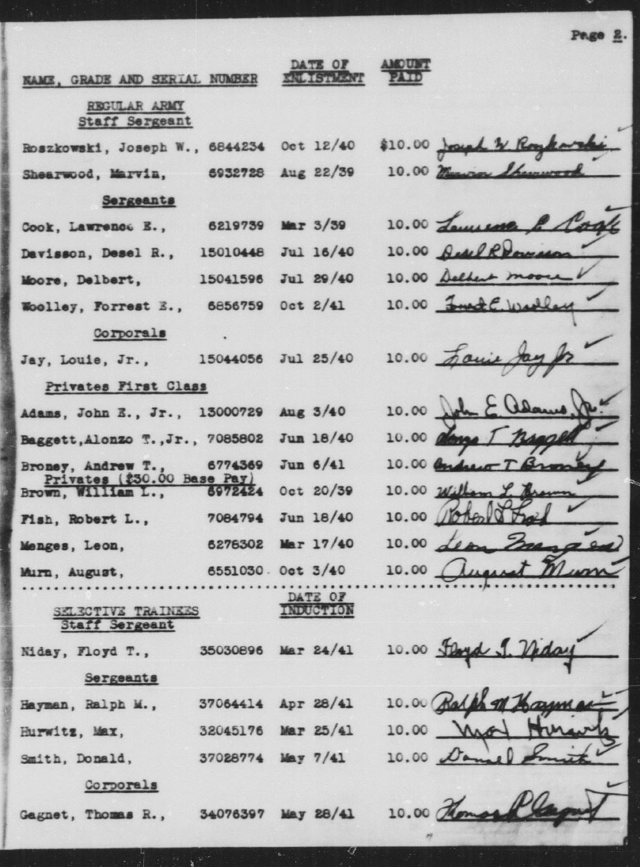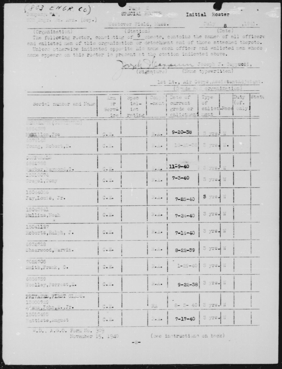 “Initial Roster Company ‘A’, 803 Engr. Bn. Avn. (Sep.) Westover Field, Mass. July 8, 1941.” U.S. Army Muster Rolls and Rosters, November 1, 1912 – December 31, 1943. Record Group 64, Records of the National Archives and Records Administration. National Archives at St. Louis, Missouri. https://s3.amazonaws.com/NARAprodstorage/lz/st-louis/rg-064/85713803_1940-1943/85713803_1940-1943_Roll-0933/85713803_1940-1943_Roll-0933_09.pdf
