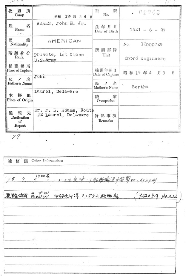 Curiously, a Japanese record card for Adams claimed that he was captured on April 9, 1942. It is unclear if this was a clerical error due to the fact that so many Americans fell into Japanese hands that day, or whether Adams remained on Bataan for some reason instead of accompanying the rest of his company to Corregidor.