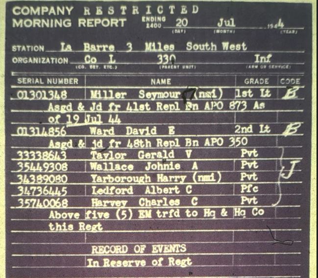 Scouring the June 1944 Company “L” morning reports on the 83rd Infantry Division Documents site again, I noticed that the morning report for July 20, 1944, and the first page of July 21, 1944, were missing. During that time, the number of 1st lieutenants increased by one. I contacted Myra Miller, one of the main researchers focusing on the 83rd Infantry Division in World War II, with my theory that his arrival was on a morning report that was inadvertently missed when the month was digitized. She quickly located the missing morning report on the original microfilm reel at the National Archives in St. Louis.