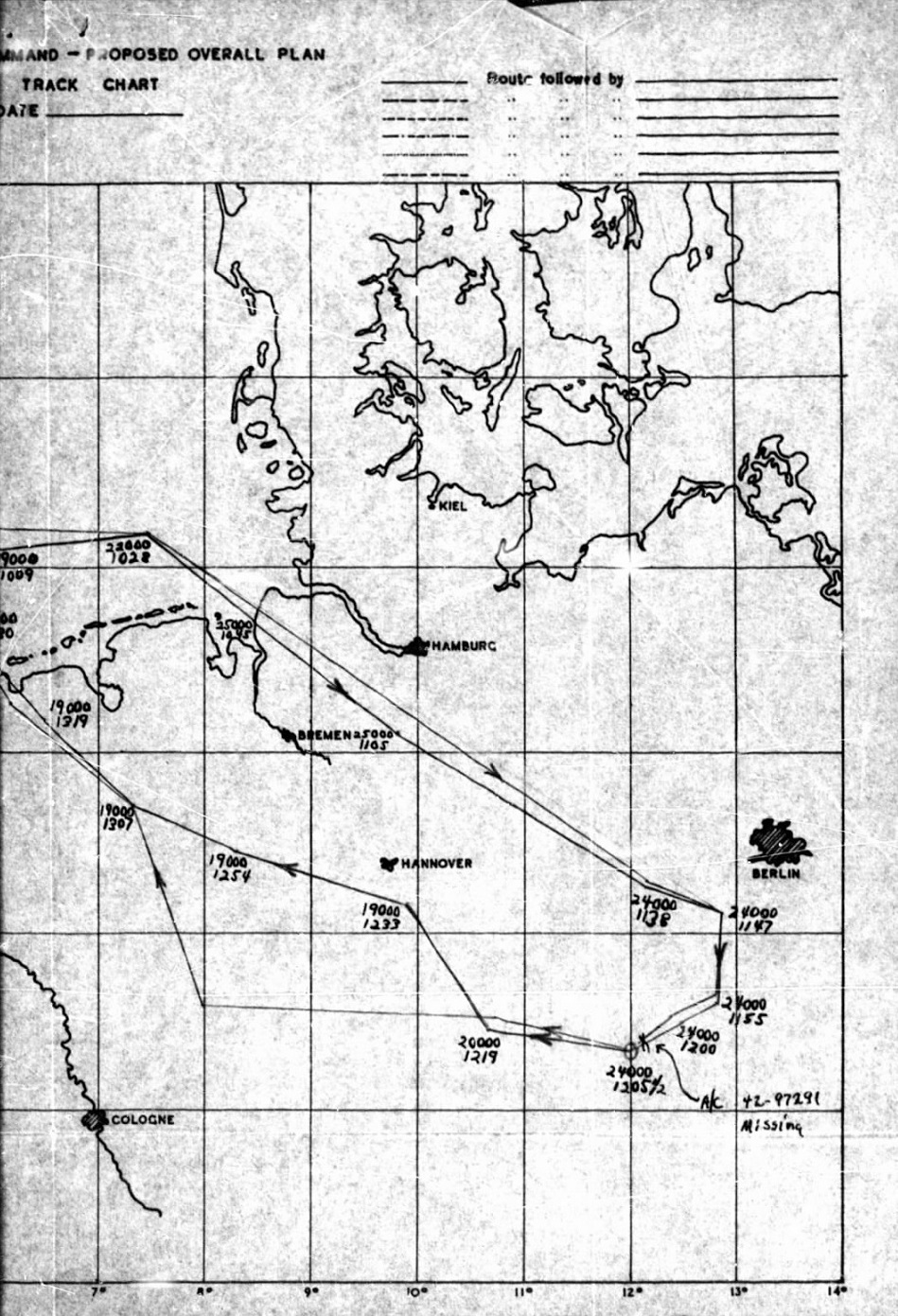 Another statement in M.A.C.R. 8212, by 2nd Lieutenant George C. Lawrenson (at the time, a tail gunner aboard another plane), recorded what happened next: “Over the target the missing A/C [aircraft] received a direct hit in the bomb bay by A/A [anti-aircraft] gunfire. The missing A/C peeled off and went into a vertical dive.”