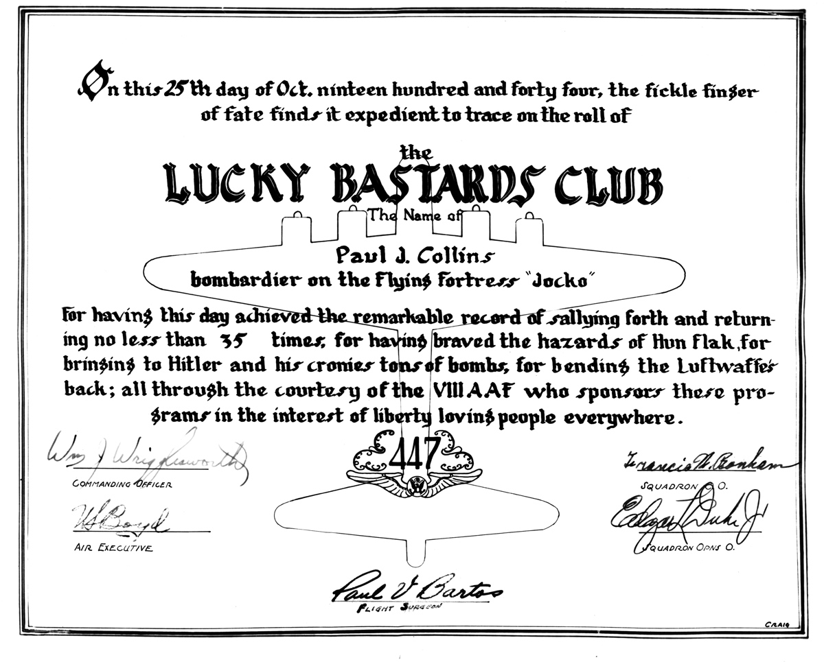 To replace Simmons, a co-pilot from another 708th crew, Lyndon F. Lakeman (1921–1996), became pilot for Collins’s first 12 missions. He also flew with four other pilots, including 16 missions with John F. Noonan (1921–1983). Contrary to the notion that crews had one plane, 447th Bomb Group records indicate that Collins flew missions in as many as 15 different B-17s, including famed planes Milk Wagon and Fuddy Duddy.