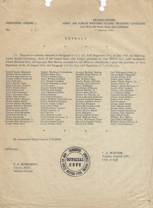 Western Flying Training Command Class 44-1 graduate list. Courtesy of the Air Force Historical Research Agency.