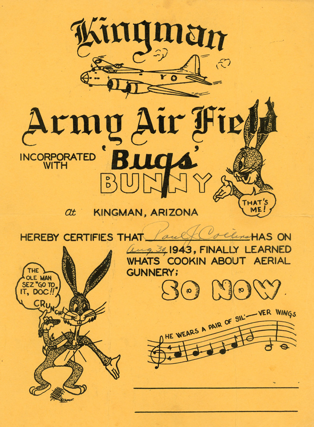 After completing preflight in mid-July 1943, Collins and the rest of his class headed east for gunnery school at Kingman, Arizona. At Kingman, Collins experienced the first flight of his life, in an AT-6, in which he operated a .30 caliber machine gun against a towed target. It was memorable for another reason as well: