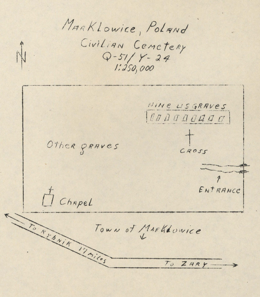 Polish civilians saw plane crash and burn near Marklowice. The nine Americans killed in the crash were buried in a common grave by Polish civilians at a cemetery in Marklowice on or around December 28, 1944. After the war, on September 5, 1947, Sergeant Steven Dzubnar, an investigator with the F.F.C. Polish Detachment, arrived in Marklowice looking for the bodies of fallen Americans, and was guided to the gravesite by Polish civilians. Sergeant Dzubnar was only able to identify one of the men at the time.
