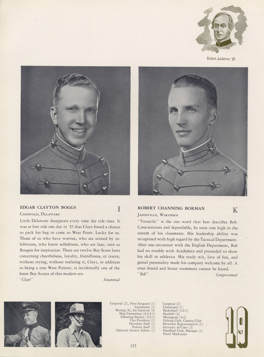 According to a statement by his mother for the State of Delaware Public Archives Commission, Boggs served in the 198th Coast Artillery of the Delaware National Guard prior to becoming a cadet at the U.S. Military Academy at West Point, New York, on July 1, 1937. L. F. M. wrote that Boggs’s “West Point activities included the Dialectic Society, boxing, Hop Manager, ‘Howitzer’ and ‘Pointer’ Staffs and Vice President of the Debating Society.”