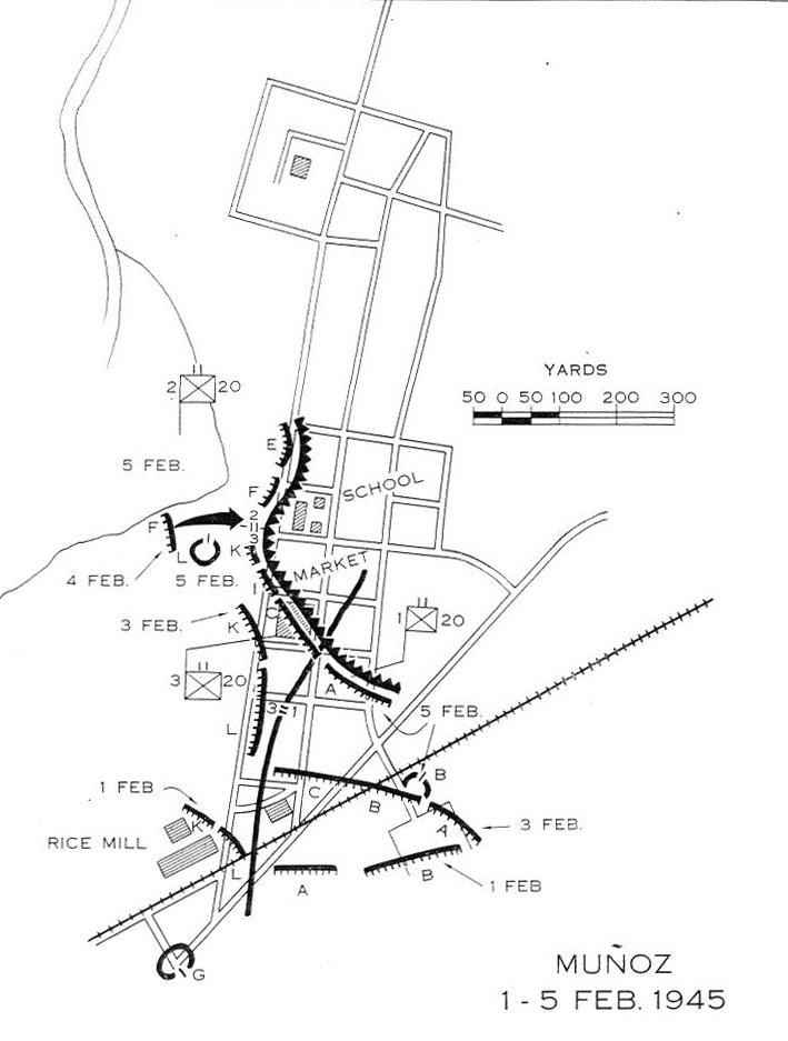 1st Battalion and 3rd Battalions of the 20th Infantry advanced towards Muñoz on the morning of February 1, 1945, where they were met with heavy rifle and machine gun fire soon from the Japanese defenders. Captain Kane wrote that