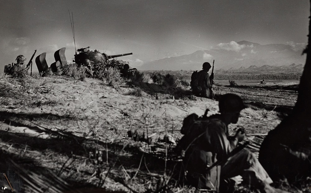 Company “B” swung wide through the open rice field south of the town and came under enemy fire when they reached the south side of the Cemetery. Company “B” vigorously pushed their attack in the Cemetery, thereby helping to relieve the pressure on Company “A” who then was able to advance […] With Company “A” giving good rifle support from the southwest edge of the Cemetery, Company “B” pushed slowly north through the Cemetery, suffering numerous casualties from the enemy’s direct fire, until they reached the ditch running along side the south edge of the Highway.
