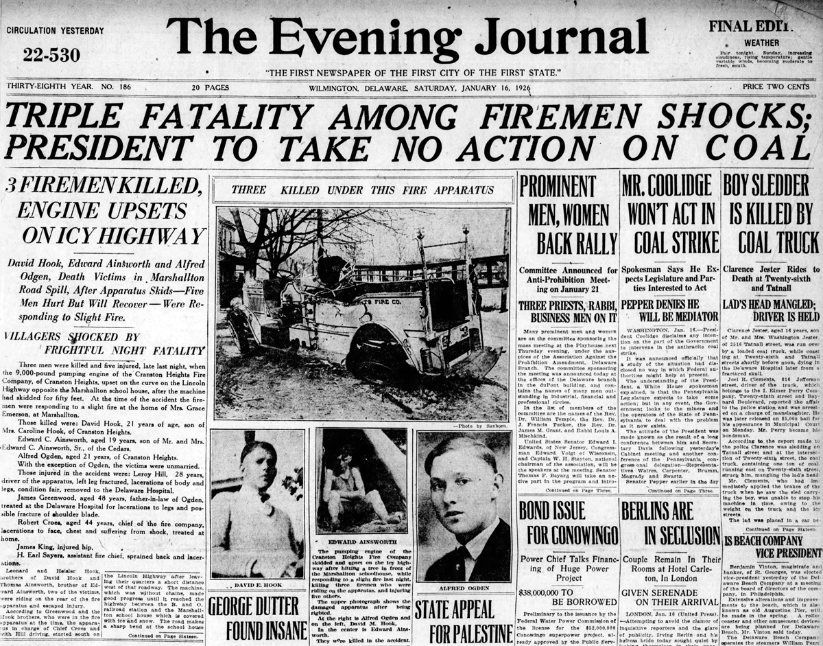 “3 Firemen Killed, Engine Upsets on Icy Highway.” The Evening Journal, January 16, 1926. https://www.newspapers.com/clip/91042385/david-hook-killed-pg-1/, https://www.newspapers.com/clip/91042486/david-hook-killed-pg-2/