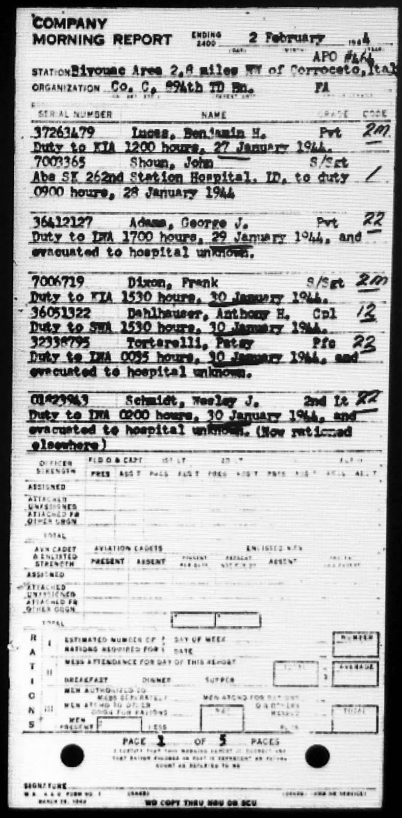 The morning report only mentioned two Company “C” casualties at 1530 hours on January 30, 1944, rather than the three mentioned by Yeide: Staff Sergeant Dixon and Corporal Anthony Henry Dahlhauser (1917–1992), who was seriously wounded by a shell. Corporal Dahlhauser was subsequently treated at the 300th General Hospital. Although he recovered enough to leave the hospital by August 1944, his wounds were so severe that he was discharged from the U.S. Army on October 27, 1944.