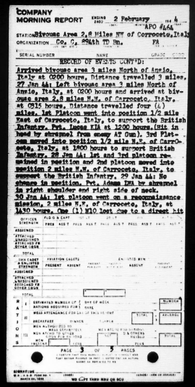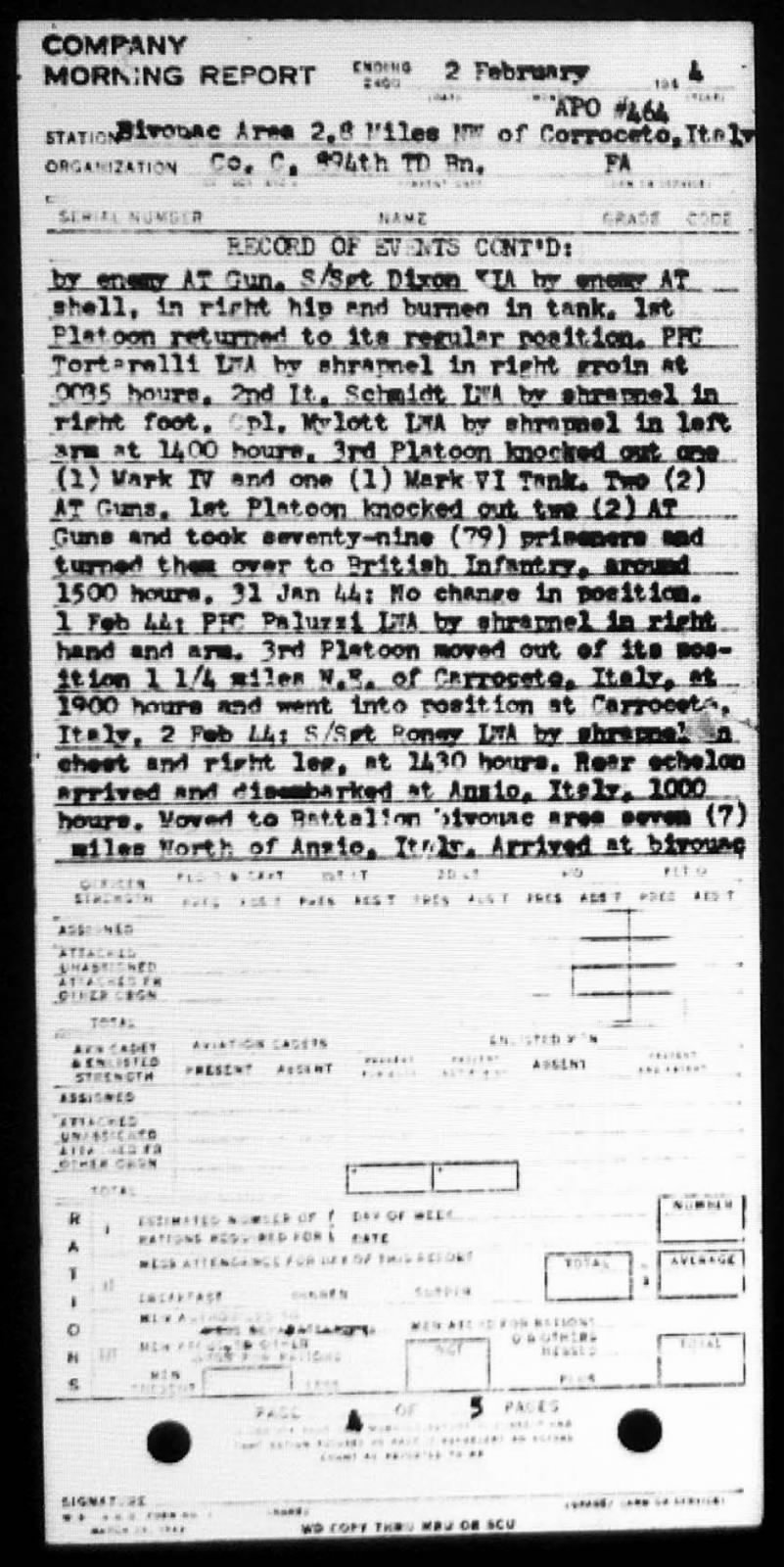 30 Jan 44: 1st platoon went on a reconnaissance mission, 2 miles N.E. of Carroceto, Italy, at 1430 hours. One (1) M10 lost due to a direct hit by enemy AT Gun. S/Sgt Dixon KIA by enemy AT shell, in right hip and burned in tank. 1st Platoon returned to its regular position.